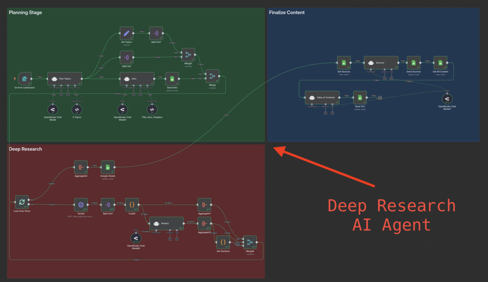 - AI writes detailed Markdown content for each subtopic using retrieved sources.