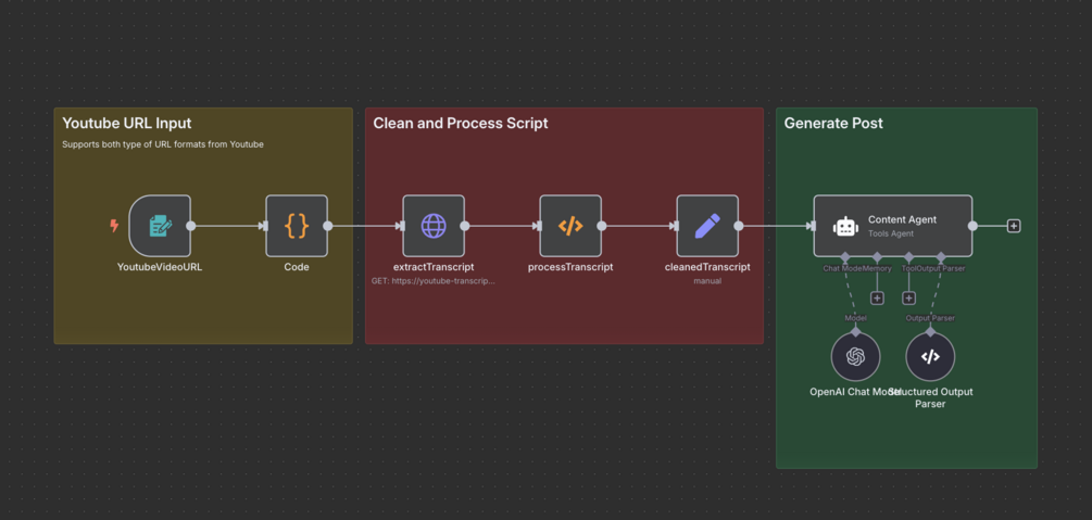 - Generate Post: Sends the cleaned transcript to an OpenAI Chat Model which drafts a social-media–ready post formatted.